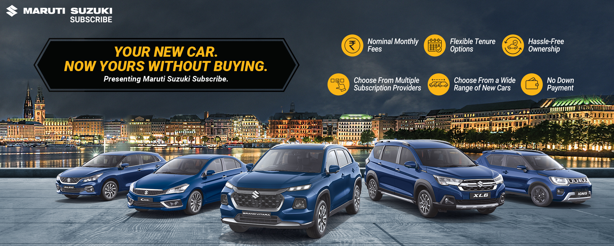 Maruti Suzuki Subscribe enables all customers to enjoy driving their preferred Maruti Suzuki cars without having to deal with all the financial responsibilities that come with owning a car.All you need to do is opt for a monthly subscription plan at a fixed monthly fee, which includes the routine maintenance and insurance costs, and choose a flexible tenure. At Kataria Automobile in, , Surat, all Hatchback, Sedan, SUV, the MUV models line-up includes Baleno, Invicto, EVitara, Jimny, Ciaz, Ignis, Fronx, Grand Vitara, XL6. Here, you will enjoy Maruti Suzuki Subscribe benefits such as: